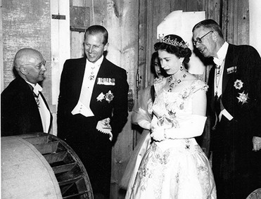 Agne Beijer visar runt Prins Philip, Drottning Elizabeth II och Kung Gustaf VI Adolf bakom scenen vid galaföreställning på teatern den 14 juni 1956. Foto: Reportagebild